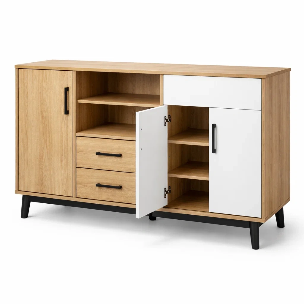 Buffet en bois comprenant deux portes et trois tiroirs pour un rangement optimal. La structure est en panneaux de particules avec un effet chêne et MDF blanc, offrant un design fonctionnel. Dimensions: 120 cm de long, 40 cm de large et 80 cm de haut. Capacité de charge maximale par étagère: 15 kg.