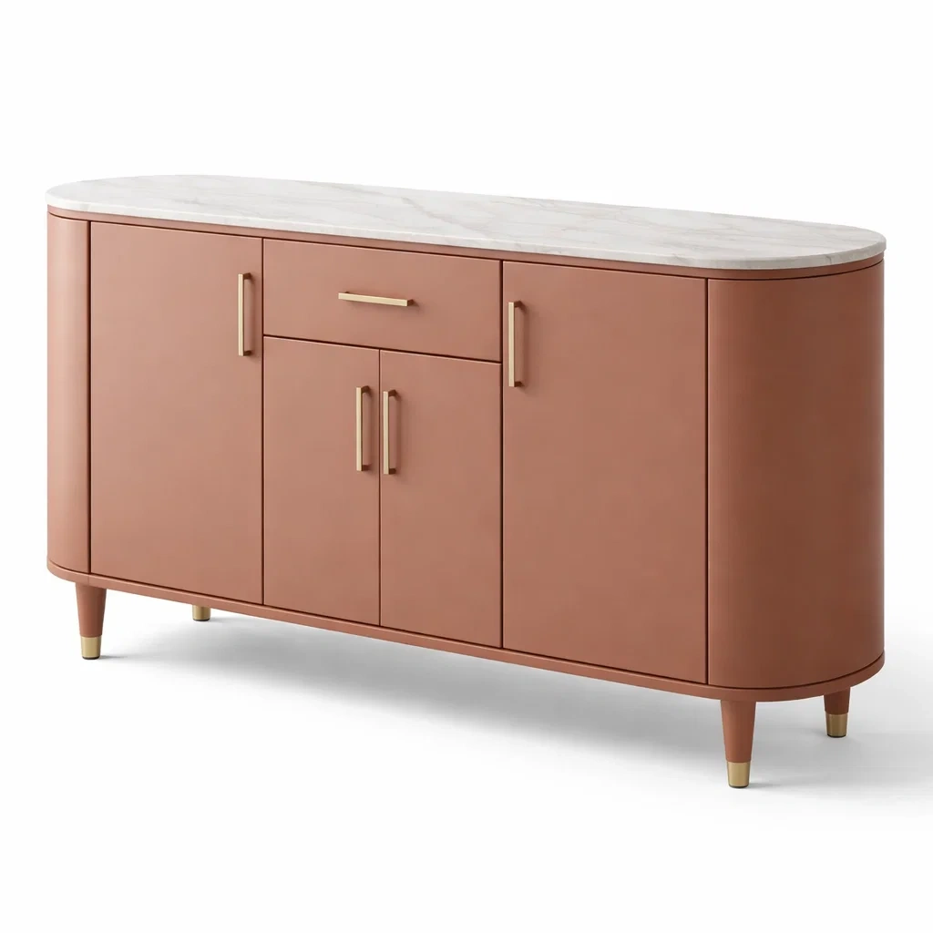 Ce buffet ovale est fabriqué en bois avec un plateau en marbre blanc veiné. Il comprend quatre portes et un tiroir, offrant un espace de rangement pratique.