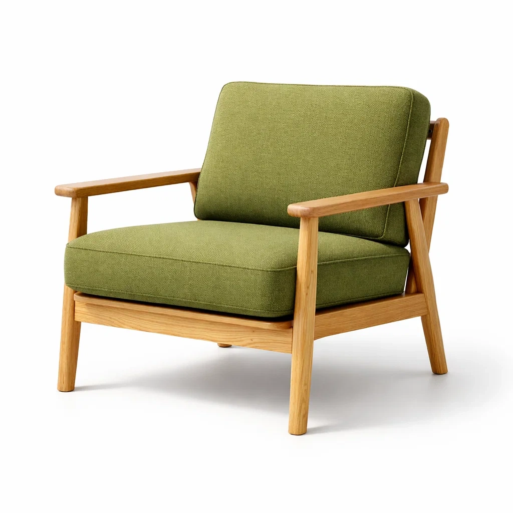 Ce fauteuil présente une structure en bois, avec un revêtement en tissu polyester vert. Le rembourrage est en mousse haute densité. Les coussins sont déhoussables. Dimensions : hauteur 75 cm, largeur 80 cm, profondeur 85 cm. Capacité de charge maximale : 120 kg. Nettoyage à sec recommandé.